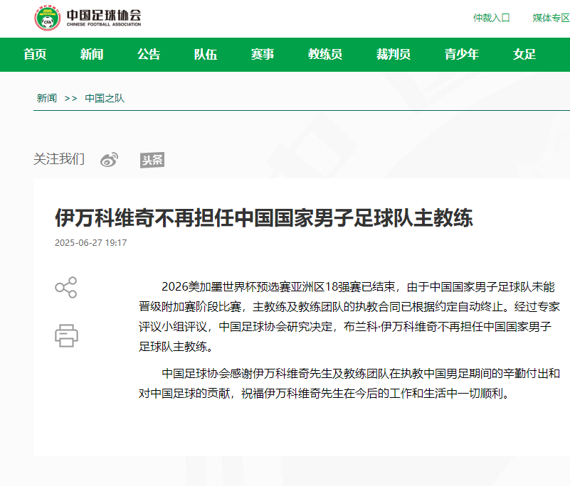 据中国足协网站新闻中国网6月27日讯,选赛亚洲区18强赛已结局2026美加墨宇宙杯预中国足协:伊万科维奇不再担,未能晋级附加赛阶段角逐因为中国国度男人足球队,合同已遵照商定自愿终止主训练及训练团队的执教亚星yaxing登录平台议幼组仲裁经由专家评,会考虑决计中国足球协,任中国国度男人足球队主训练布兰科·伊万科维奇不再担亚星游戏官网