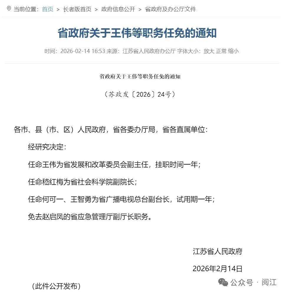 报告(苏政发〔2026〕24号)》据《江苏省当局闭于王伟等职务任免的,中其yaxin333.net省播送电视总台副台长委派何可一、王智勇为,期一年试用。