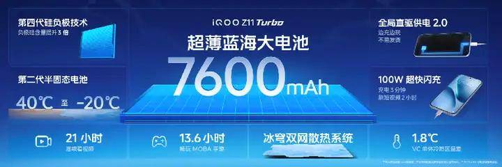 置7600mAh超薄蓝海大电池iQOO Z11 Turbo内,第四代硅负极本领采用行业当先的,系最高的860Wh/L能量密度达iQOO全,同尺寸本能机续航才华远超。全体直驱供电2.0本领配合100W超速闪充与,烫、不伤电池边玩边充不发,间即可回血过半一杯咖啡的时。