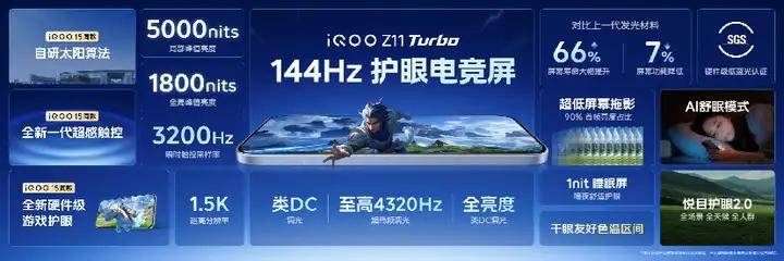59英寸1.5K 144Hz护眼电竞屏iQOO Z11 Turbo装备6.,频调光、全亮度类DC调光三重护眼计划接济类DC调光、至高4320Hz超高,低蓝光与低频闪认证通过SGS硬件级,人群、全场景护眼完毕全天候、全。